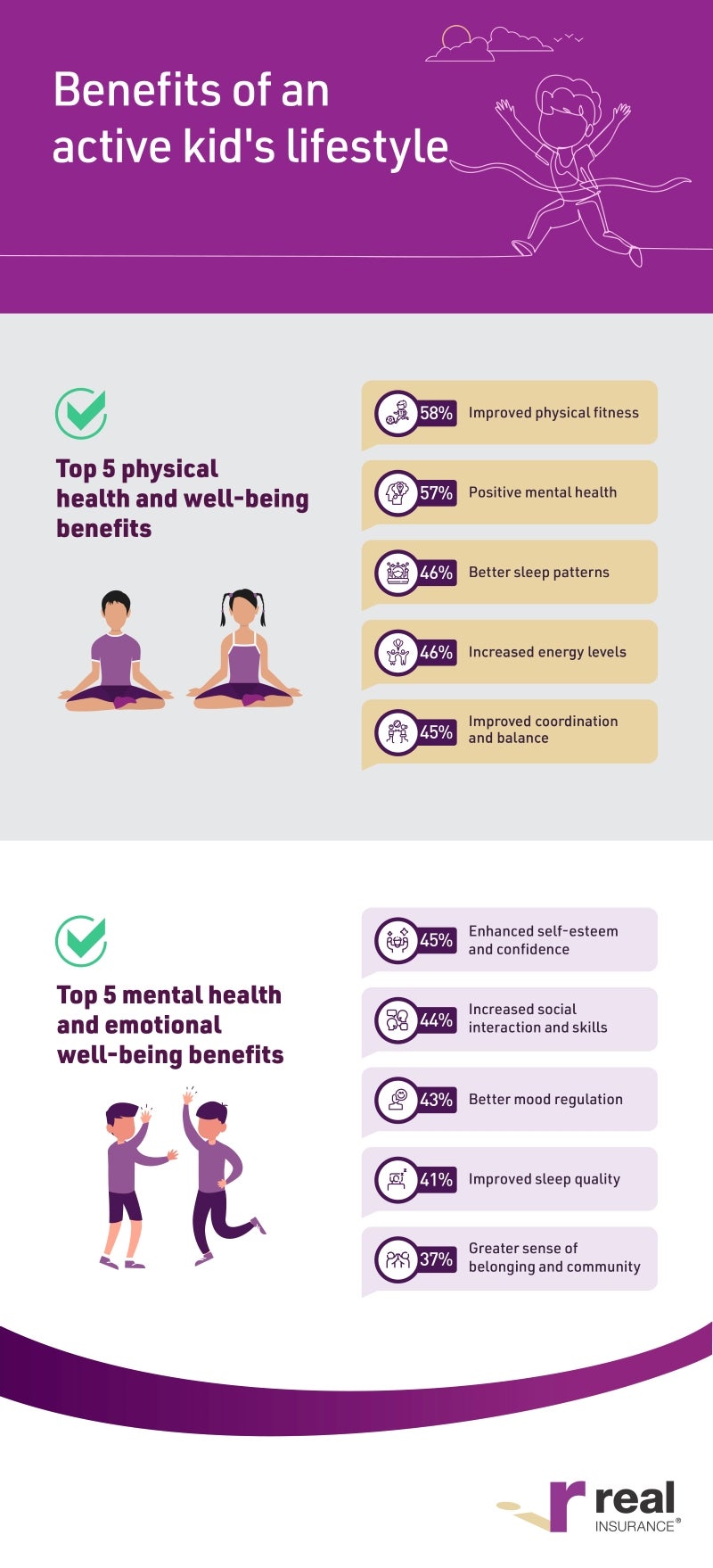 Parents also cited a positive correlation between an active lifestyle and healthy sleep, with almost half (46%) noticing better sleep patterns in active kids, indicating a positive correlation between an active lifestyle and healthy sleep. Increased energy levels (46%) and improved coordination and balance (45%) were also found to be key outcomes of an active lifestyle.