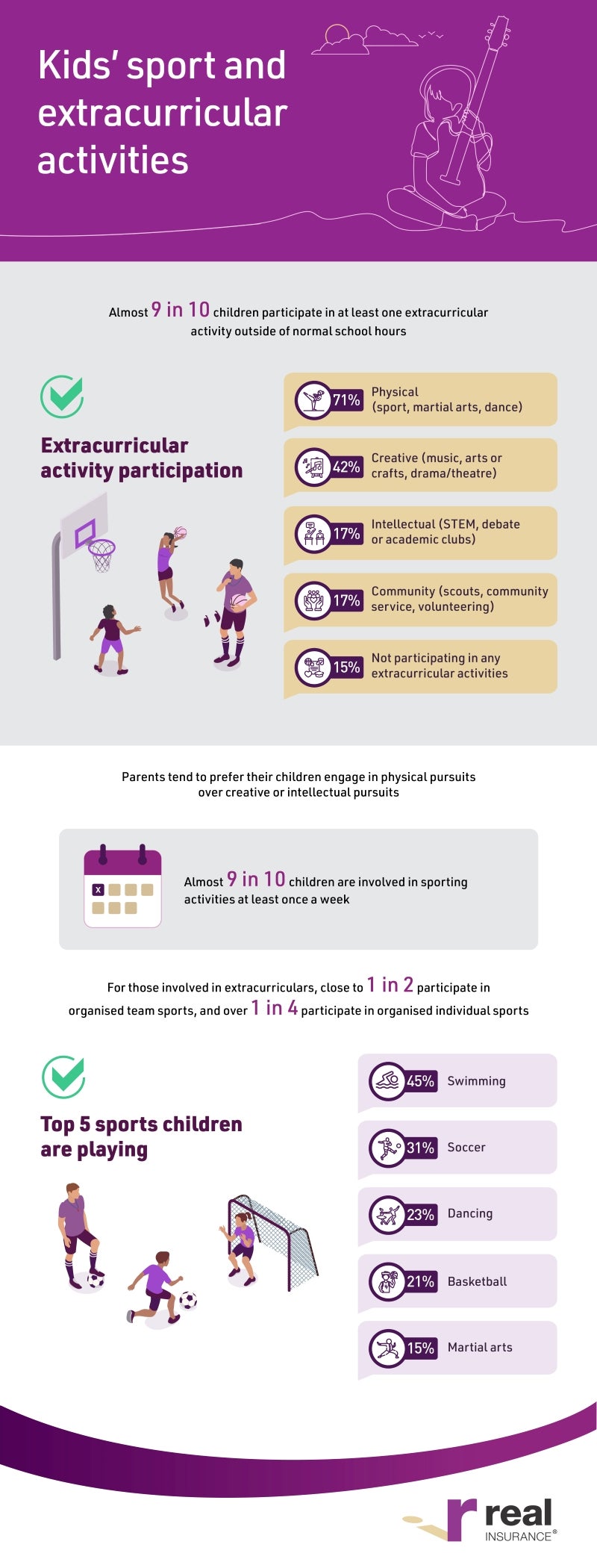 The Real Healthy Kids Report 2024 explores the multifaceted landscape of parenting in contemporary Australia. From fostering positive relationships with physical activity to nurturing creative talents, the ways in which Aussie parents support their children's holistic development are varied and dynamic. In fact, almost 9 in 10 (85%) Aussie kids participate in at least one extracurricular activity, with many choosing physical activities (71%), followed by creative pursuits like music and art (42%).